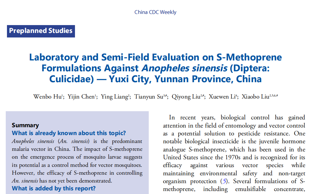 These results offer valuable options and guidance for utilizing S-methoprene products in malaria reimportation prevention areas within Yunnan Province.