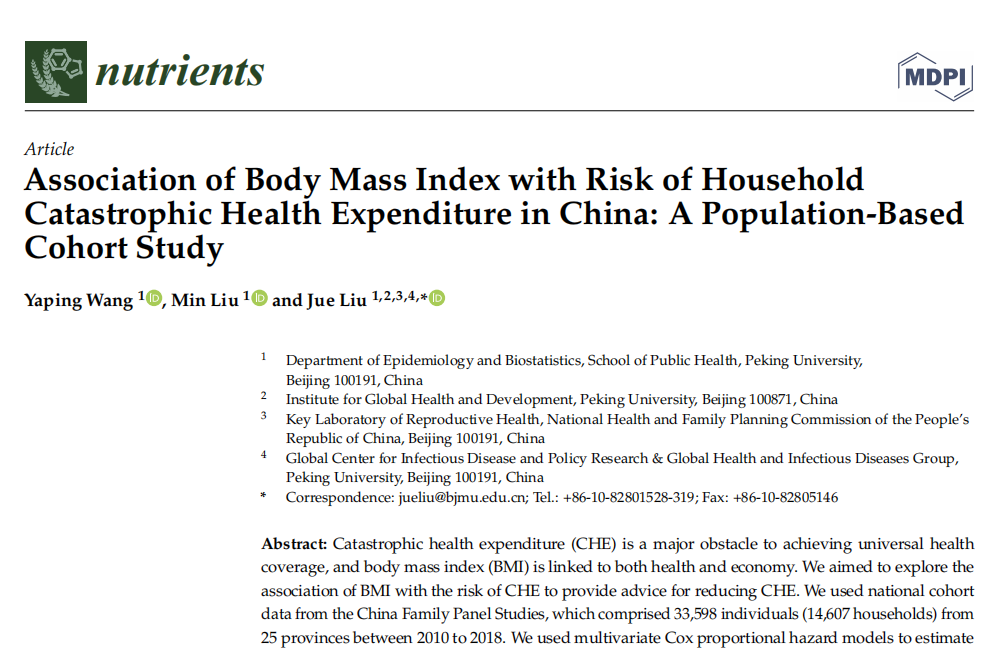 Catastrophic health expenditure is a major obstacle to achieving universal health coverage, and body mass index is linked to both health and economy. We aimed to explore the association of BMI with the risk of CHE to provide advice for reducing CHE.
